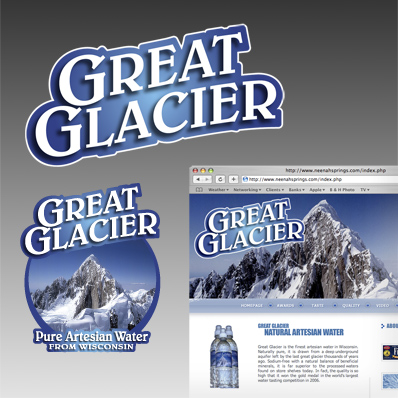 Identity and Branding A logo for Great Glacier spring water was needed as part of a web design project at TTS Sytems. A type-only version was used as part of the masthead on the website.